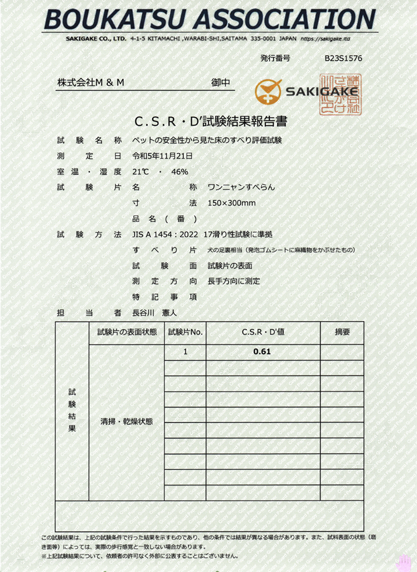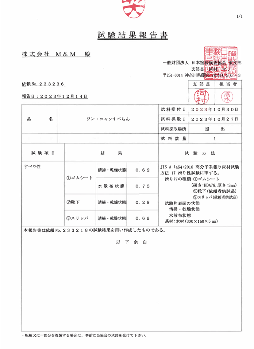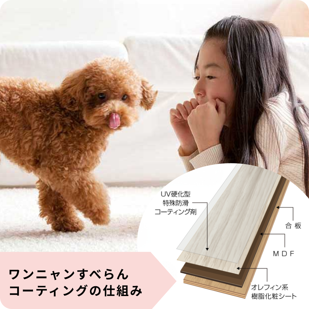 室内飼育用のペット専用に開発され、第三者機関にてペットに必要とされる日本工業規格(JIS)評価試験をクリアした家族の一員であるペットと人が、安全に安心して暮らせる最適なフロアコーティングです。