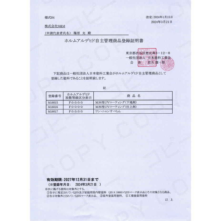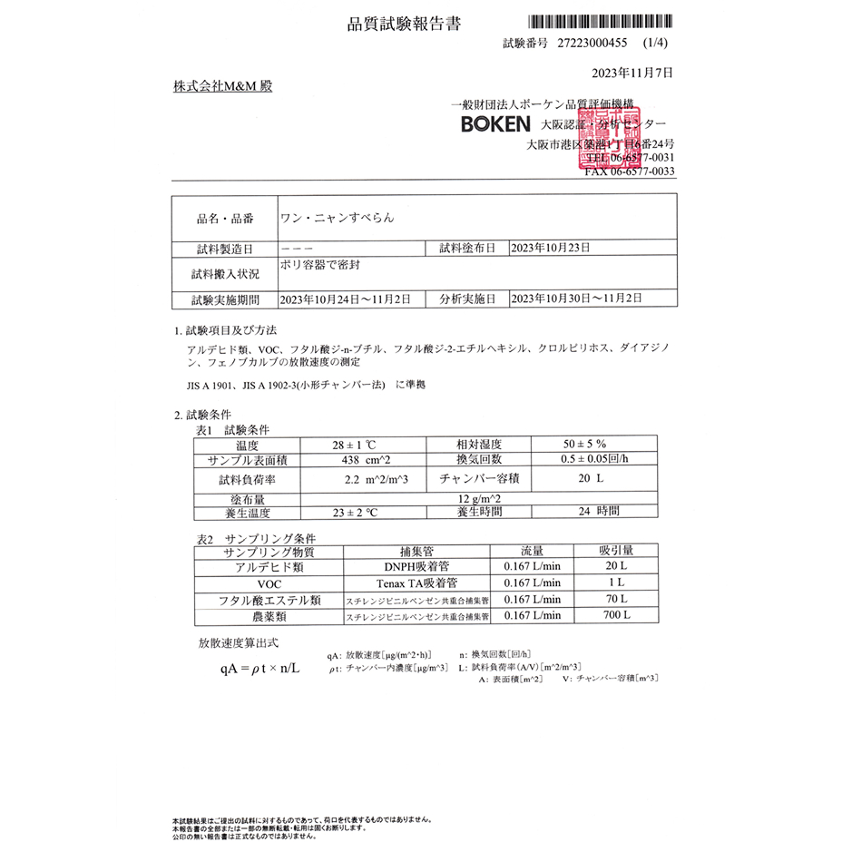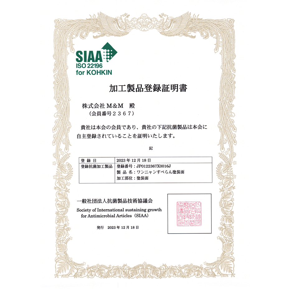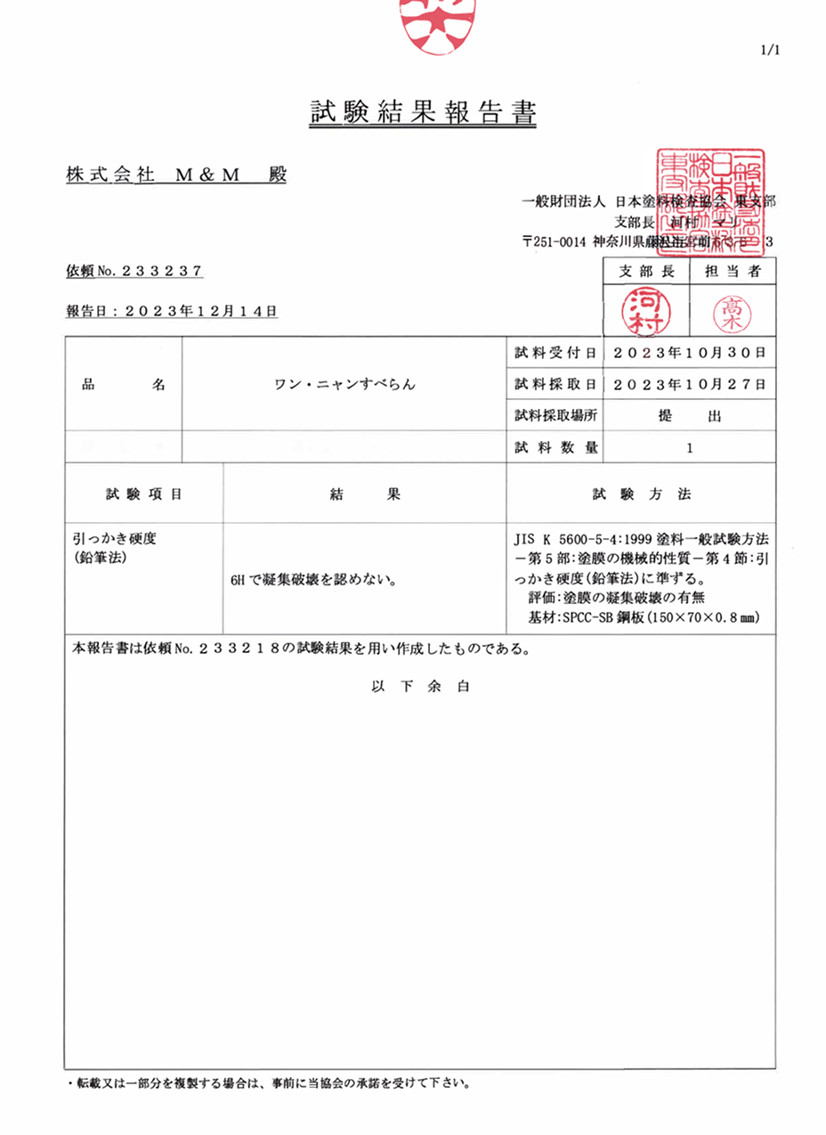 室内飼育用のペット専用に開発され、第三者機関にてペットに必要とされる日本工業規格(JIS)評価試験をクリアした家族の一員であるペットと人が、安全に安心して暮らせる最適なフロアコーティングです。