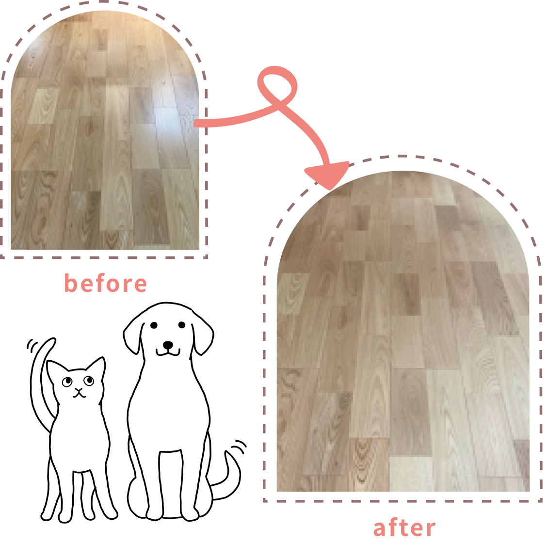 ペットにやさしい専用コーティング剤を均一に塗布し、滑りにくく清潔な床へと仕上げます。